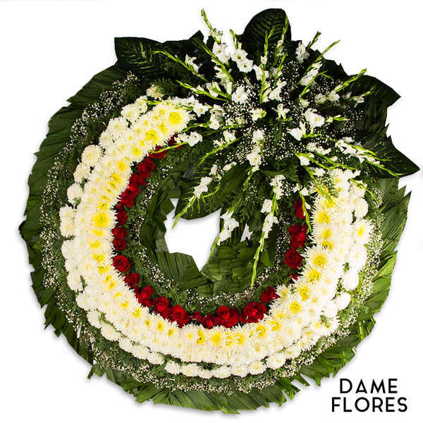Corona con Polares, Margaritas, Gladiolas, Gipsófilas (Babies), Rosas rojas.