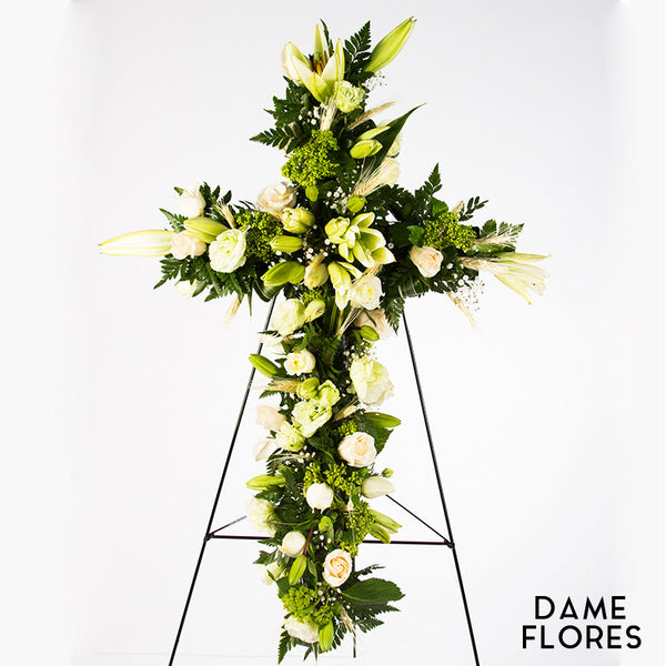 7 Lilis Blancas, 24 Rosas Blancas, Base de Follaje y Trigo con Tripie