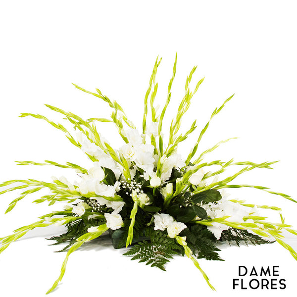 Pie de Caja con Gladiolas, Rosas y Gipsófilas (Babies) Blancas