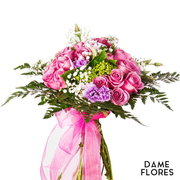 Ramo de 20 Rosas rosadas, 05 varas de Lisianthus, Gipsófila (Babies) y Follaje envuelto con un moño color rosa